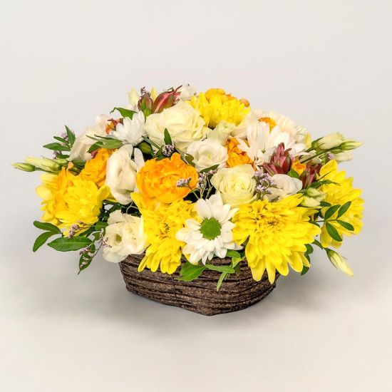 - Flowers: The basket includes santini, spray roses and other seasonal flowers