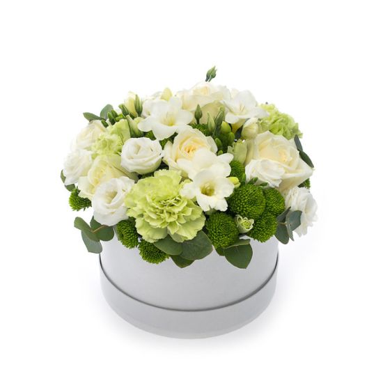 Flowerbox with a white, cream color scheme that is both calming and memorable. Roses are symbols of romance and passion, while santinis bring a sense of elegance and exclusivity. All these together form this magical flower composition.