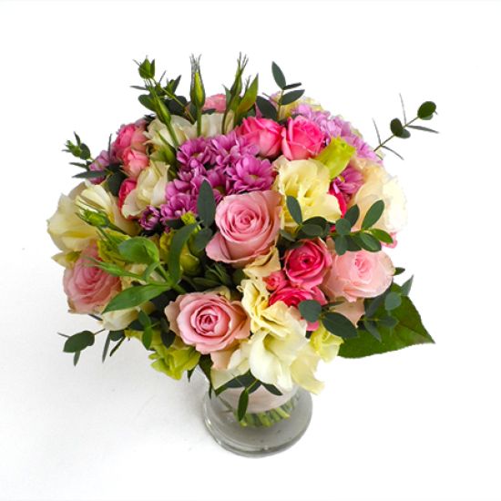 - Összeállítás: Kiváló minőségű, friss, rózsaszín és világos színvilágú virágok